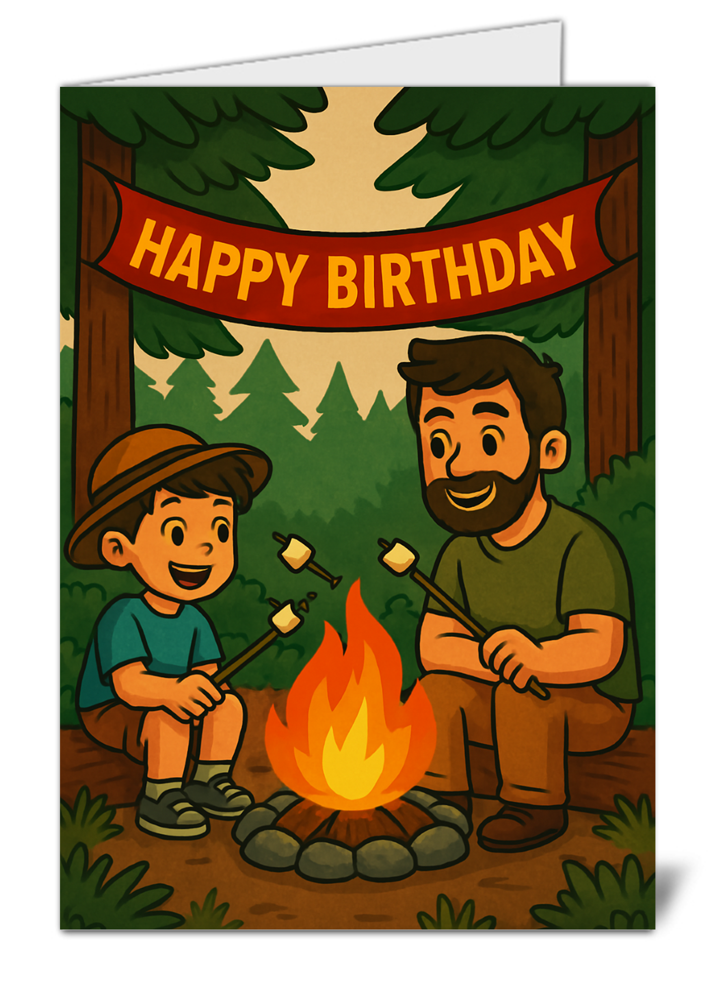 Make their birthday more meaningful with this camping birthday card, designed for those who love the outdoors, family moments, and adventure-themed designs. Featuring a heartwarming father and son roasting marshmallows by the campfire, this card is perfect for dads, sons, grandads, or anyone who enjoys camping and spending time in nature.