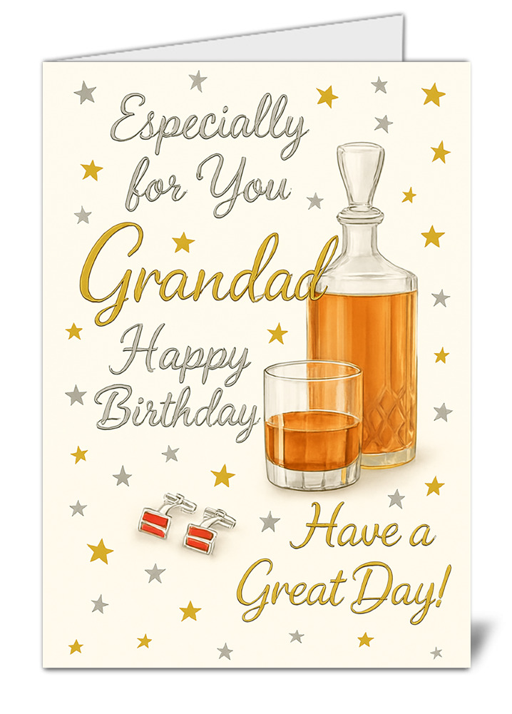 Make his birthday feel extra special with this grandad birthday card, designed for families who want a thoughtful and stylish card for a much-loved grandad. Featuring an “Especially For You” whisky and gold stars design, this card is a lovely choice for showing love and appreciation on his birthday with something more personal than a standard greeting card.
